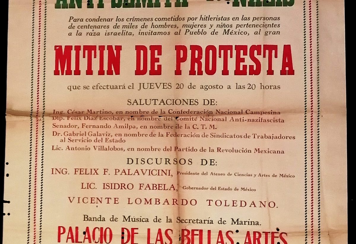 El Centro de Documentación e Investigación Judío de México (CDIJUM) resguarda un cartel emblemáticos del mitin, llevado a cabo en 1944.