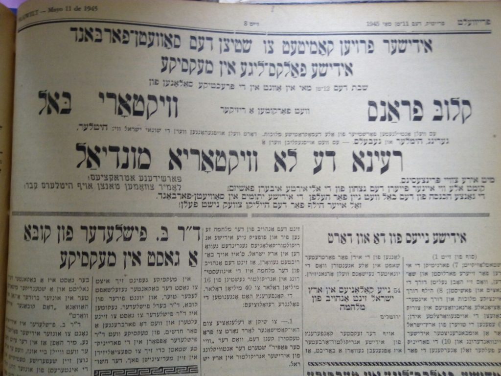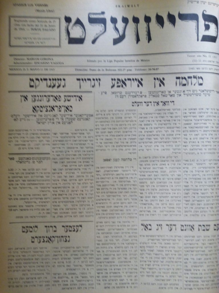 Periódicos judíos de México anunciaban el fin de la guerra en Europa, como fue el caso del Fraiwelt, que el 11 de mayo anunciaba en su primera plana: “La Guerra en Europa ha llegado a su fin”. Este periódico alababa las acciones del Ejército Rojo, pues su editorial se había formado con la Liga Israelita Pro ayuda a la Unión Soviética, que más tarde se cambió el nombre por la Liga Popular Israelita de México.